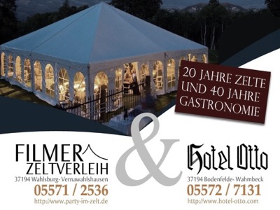 Gemeinsame Visitenkarte der Unternehmen Filmer Zeltverleih aus Uslar und Hotel Otto aus Wahmbeck. Die Visitenkarte stellt die Synergie der beiden Geschäftspartner mit der Erfahrung aus 20 Jahren Zeltverleih und 40 Jahren Gastronomie für die kommende Zeltsaison dar.